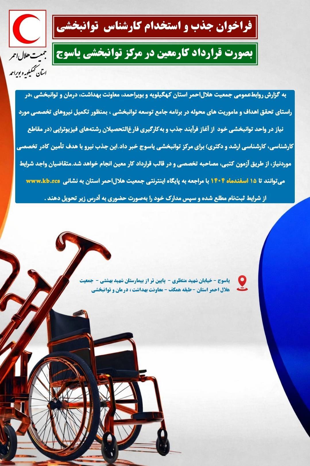 فراخوان جذب و استخدام کارشناس توانبخشی به صورت قرارداد کار معین در مرکز توانبخشی یاسوج